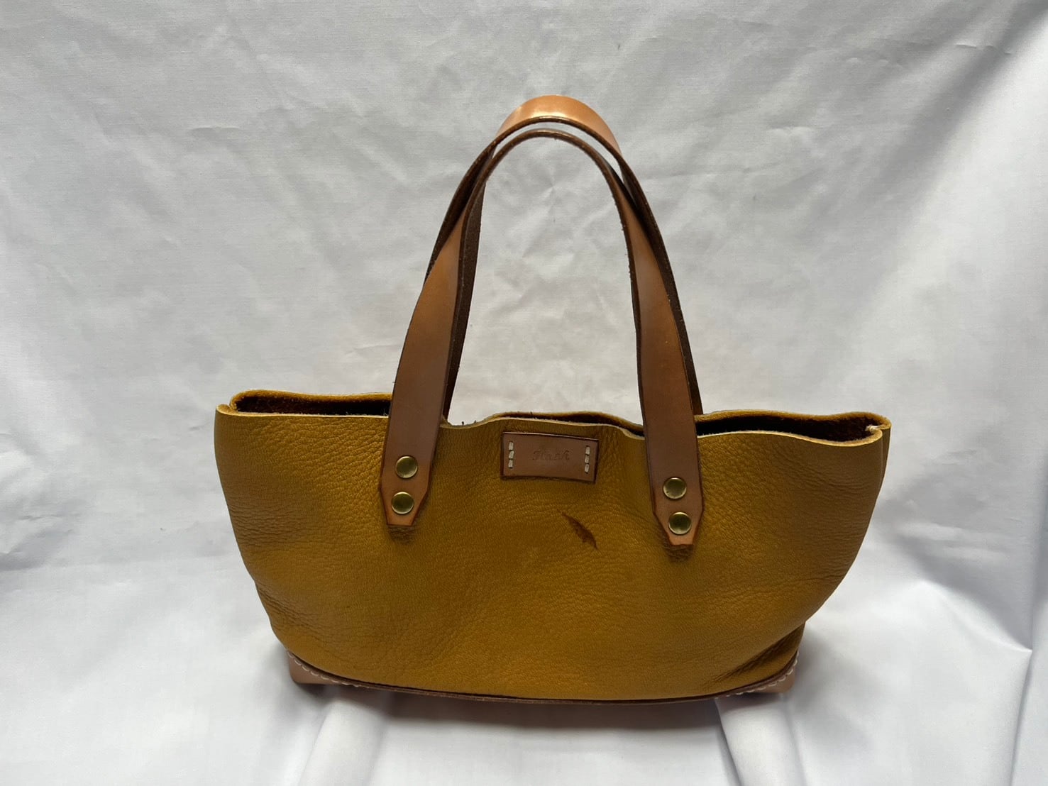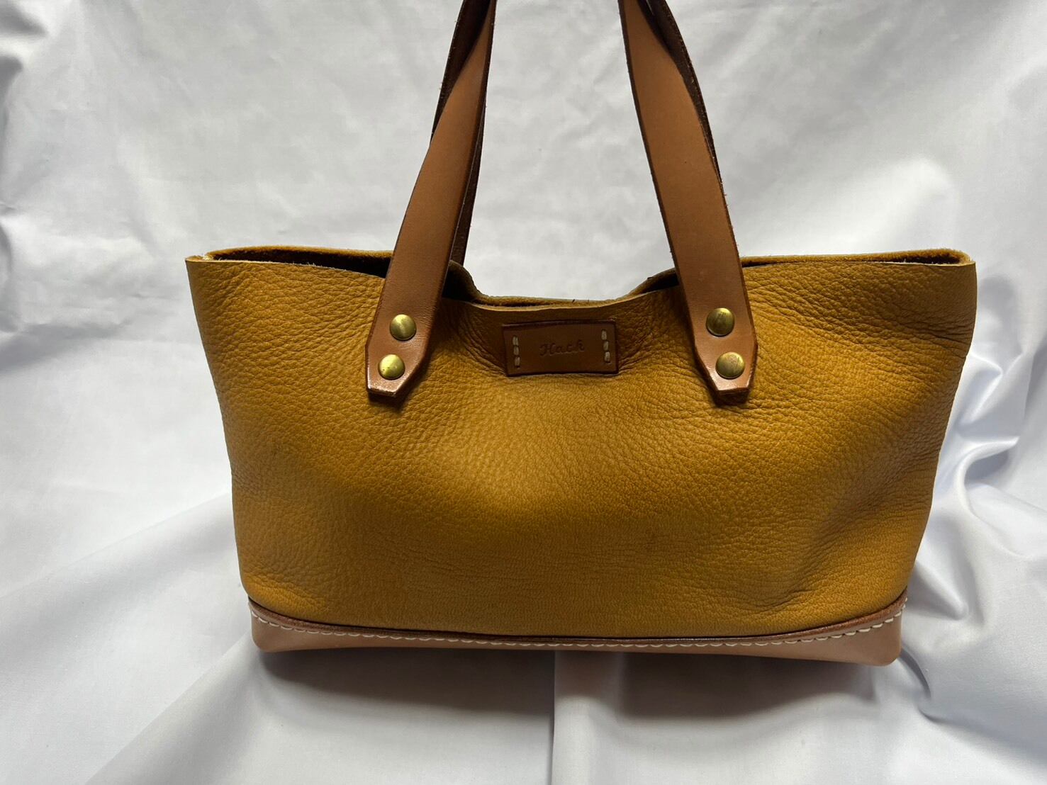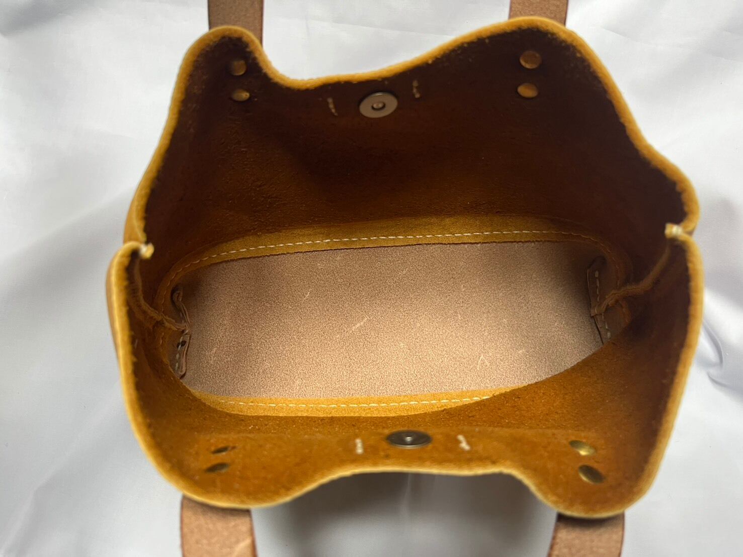 底面と持ち手には栃木レザーのヌメ革を使用しています。